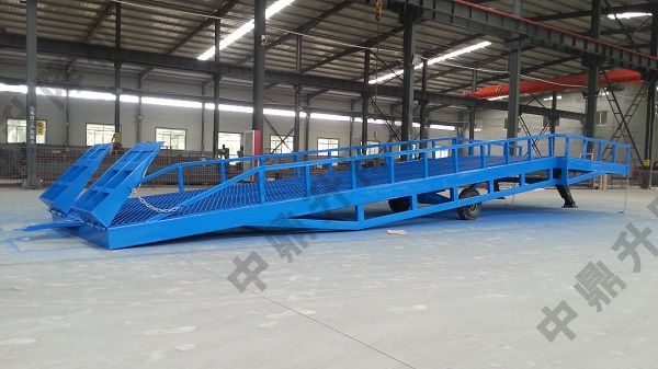 移動登式登車橋是作為橋接貨車車廂裝卸的輔助設備,叉車通過本設備進行快速裝卸,效率極高,又能在不同位置作業,靈活性比較強。當然這也是它的缺點,占據面積較大需11-13米,雖說可移動,但是移動也比較麻煩。