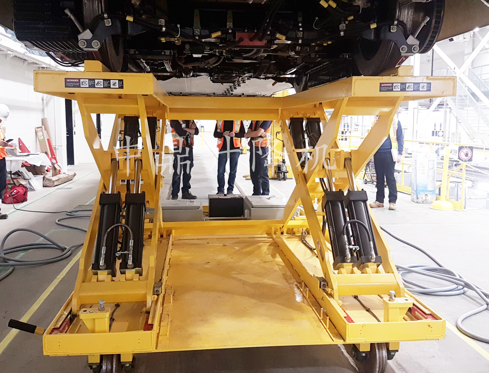 一旦在軌道車輛的卡車/轉向架下,升降機就入當地的電源以操作起重動作。當處于升高的位置時,在操作員進入剪刀式升降機下方之前,他們將可調節的維護支撐塊定位到位??烧{節的維護支撐塊在下降前被移除。當降低并拔下電源插頭時,推車可以在有或沒有負載的情況下穿越。