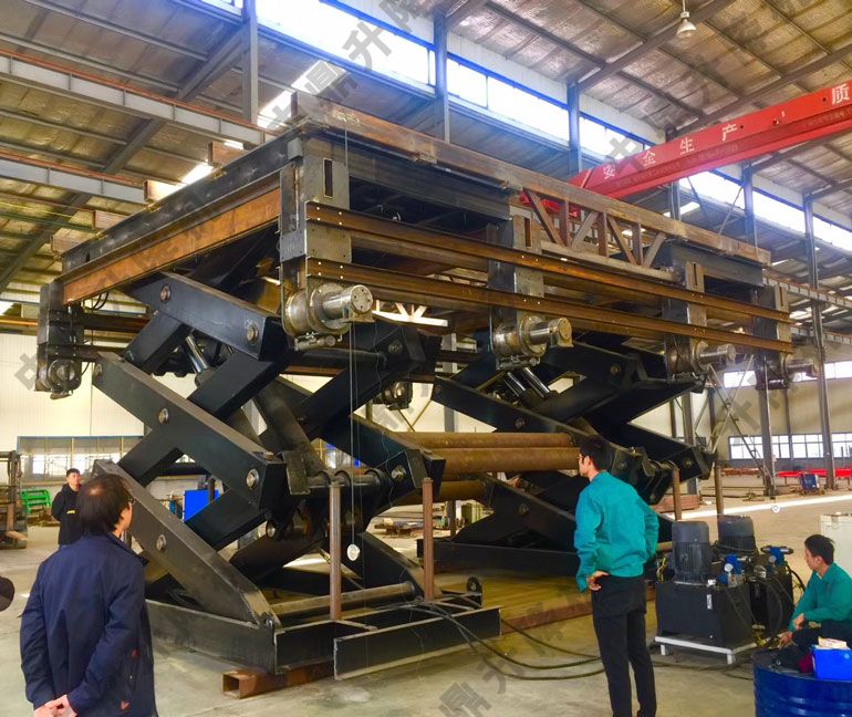 面積貨物而設計的超大臺面的一種升降平臺車,載重100噸液壓升降平臺。